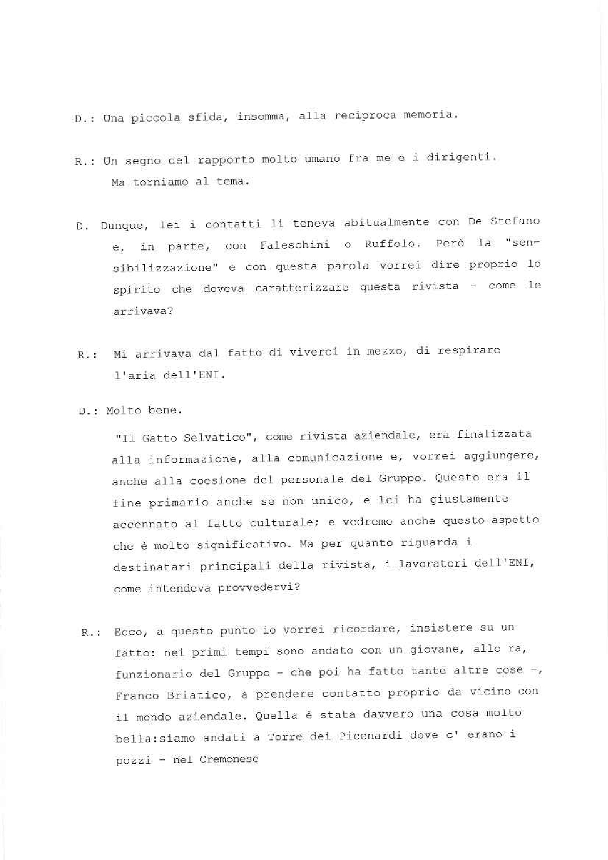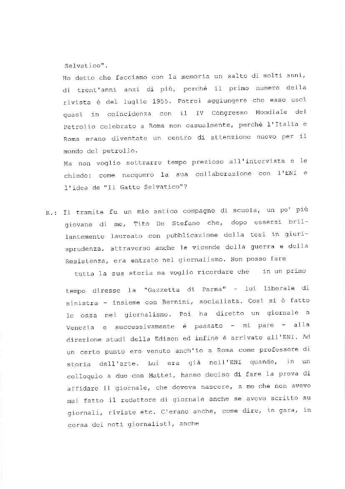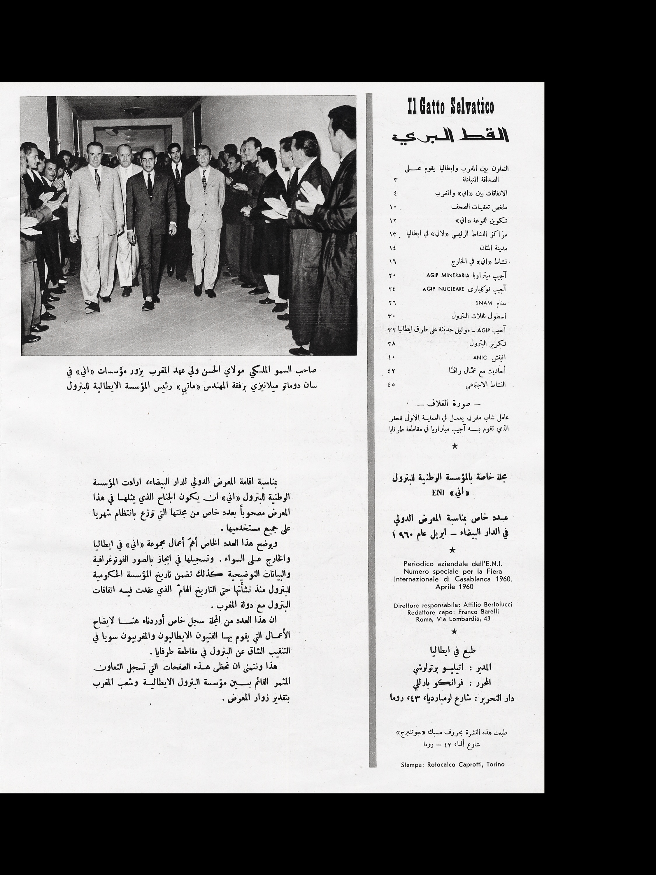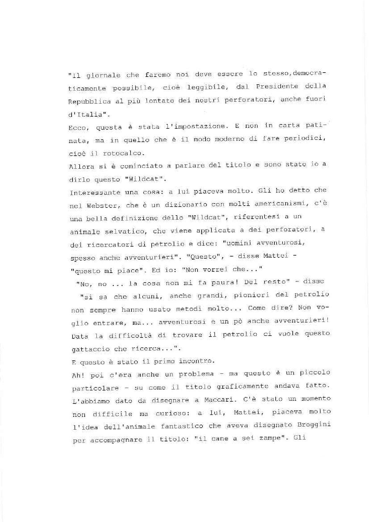 Sono lieto di porgere il mio saluto augurale al “Gatto Selvatico” la nuova rivista che si propone di assolvere il compito – modesto, ma essenziale – di servire da ideale punto di incontro per tutti coloro che fanno parte della grande famiglia del Gruppo E.N.I. È una famiglia in continuo aumento, così come in continuo aumento sono l’importanza e la prosperità delle società affiliate. Il numero di coloro la cui sorte è legata a quella del nostro Gruppo non soltanto è altissimo – tanto alto che solo poche aziende di vecchia data ne possono vantare uno superiore –, ma è per giunta estremamente frazionato, secondo le molteplici esigenze della nostra industria.