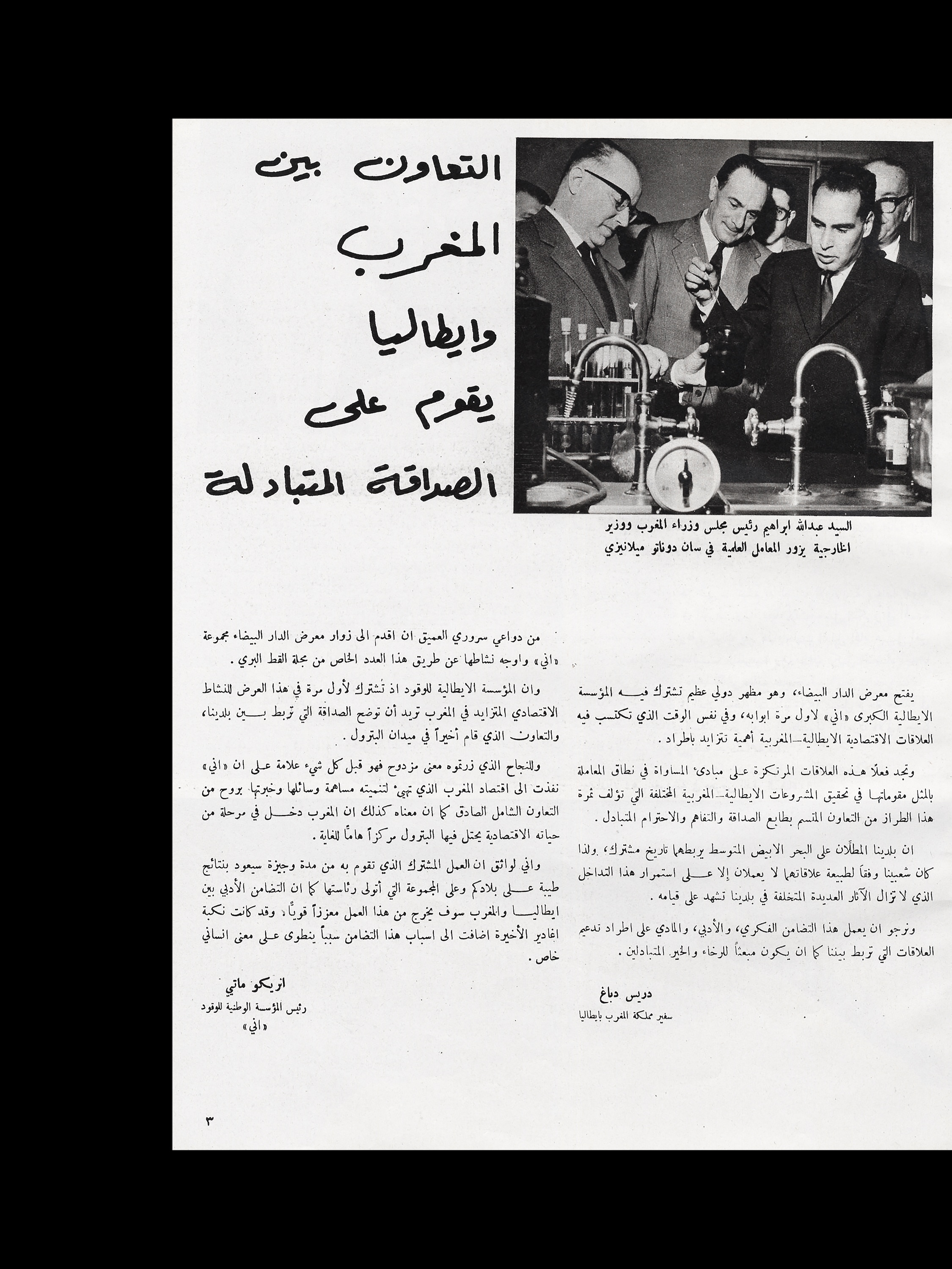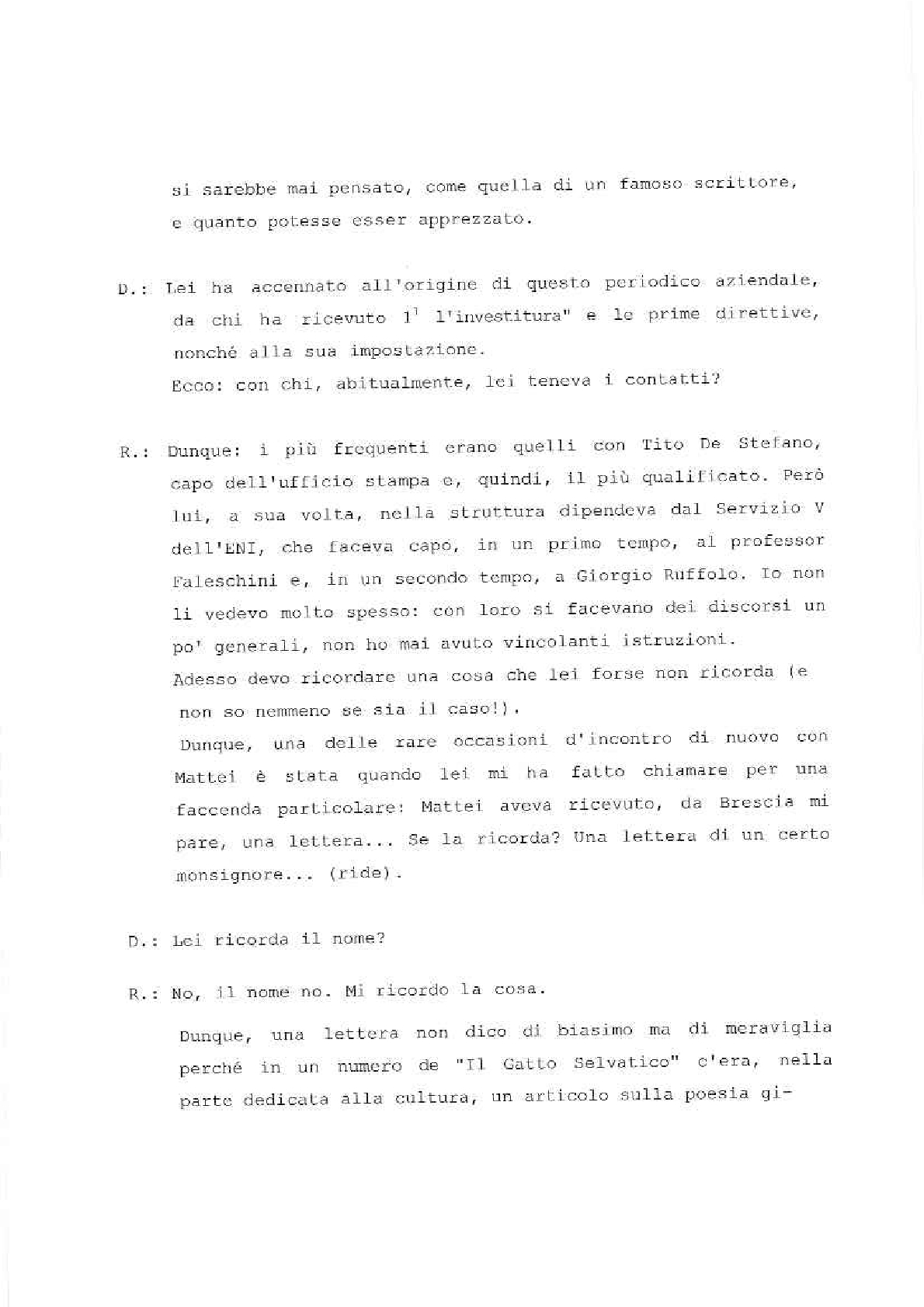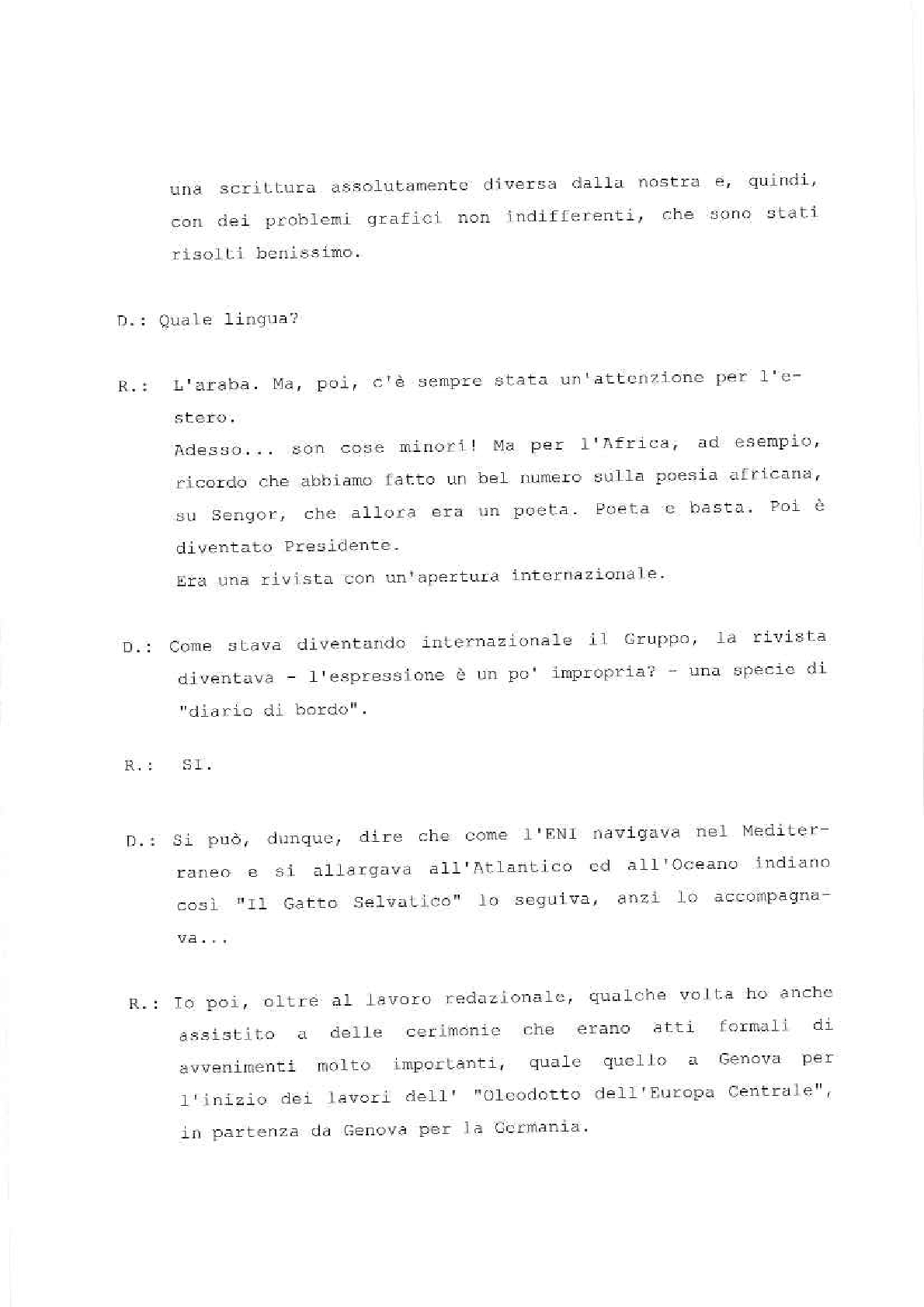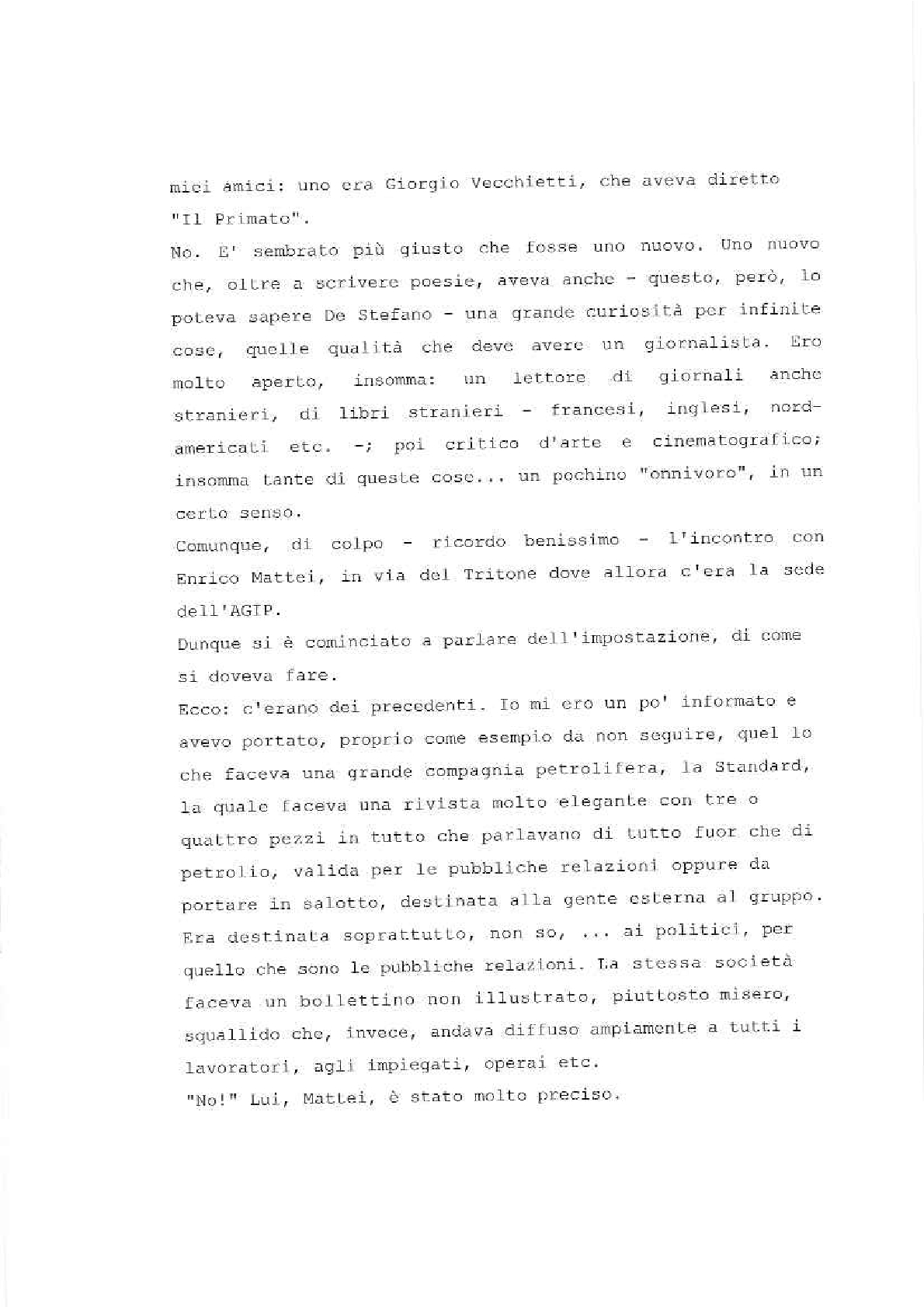 Sono lieto di porgere il mio saluto augurale al “Gatto Selvatico” la nuova rivista che si propone di assolvere il compito – modesto, ma essenziale – di servire da ideale punto di incontro per tutti coloro che fanno parte della grande famiglia del Gruppo E.N.I. È una famiglia in continuo aumento, così come in continuo aumento sono l’importanza e la prosperità delle società affiliate. Il numero di coloro la cui sorte è legata a quella del nostro Gruppo non soltanto è altissimo – tanto alto che solo poche aziende di vecchia data ne possono vantare uno superiore –, ma è per giunta estremamente frazionato, secondo le molteplici esigenze della nostra industria.