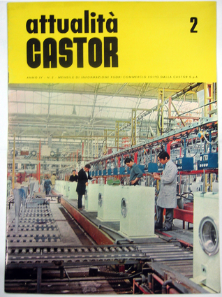 La scelta di pubblicare un giornale aziendale cade nel momento di grande espansione dell’impresa. Stampato a colori su carta patinata lucida, “Attualità Castor” non ha, nei primi numeri, le caratteristiche del bollettino aziendale per il personale, in cui i dipendenti possano riconoscersi (in fotografia e/o in attività condivise) e riconoscere al contempo l’identità dell’impresa come comunità votata a un fine collettivo: ben presente è la figura del fondatore, presidente e direttore generale comm. Francesco Casarini (in copertina con il capo dello stato Giuseppe Saragat al termine di un incontro con i dirigenti Castor, n. 11, 1966; in copertina con l’ambasciatore jugoslavo in Italia in visita agli impianti a seguito dell’accordo produttivo con la società Rade-Koncar di Zagabria, n. 1, 1967), come esplicita è la presentazione dell’impresa quale “uno dei più grandi complessi europei del settore”, con oltre 2000 dipendenti e in primo piano è il suo progetto di “conquistare in pieno il mercato europeo” (p. 3).