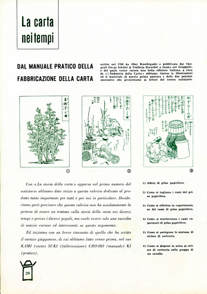 Questo numero di apertura, ha un taglio prettamente “istituzionale”. Nell’articolo Storia delle Cartiere di Verona vengono ripercorse rapidamente le tappe della Società Anonima Cartiere di Verona, costituita nel 1928 dalla fusione della S.A. Cartiera Padana di Castelvetro Piacentino e dalla Cartiera Albano Franchini, proprietaria dello stabilimento di Verona. Nel 1931 entra a far parte del gruppo anche la Cartiera Bagarelli di Milano, nel 1938 viene acquistato lo stabilimento di Longarone (Belluno) dell’Industria Veneta della Carta e del Cartone S. Marsoni e C. di Venezia e nel 1942 lo stabilimento di Vedano Olona (Varese) della Società Samec. Con 1800 dipendenti alla data dell’articolo (1957), suddivisi nei 5 stabilimenti citati, le Cartiere di Verona si posizionano tra le prime industrie italiane del settore cartario e della produzione di cartone e imballaggi. Il secondo articolo è un breve profilo biografico del Presidente della Società, Adolfo Seminari. Segue un ampio servizio sull’Asilo Vittoria a Gratosoglio (Milano), realizzato dalla Società per i figli dei dipendenti, inaugurato dall’allora arcivescovo di Milano G.B. Montini, e parte di un più grande complesso destinato alle abitazioni per gli operai del vicino stabilimento di Gratosoglio, cui è dedicato l’articolo successivo. Chiudono la rivista brevi articoli sulla storia della carta, le colonie, le medaglie d’oro assegnate ai dipendenti anziani, la partecipazione della Società alla Fiera di Milano, lo stabilimento di Verona, sorto nel 1894 come Cartiere Albano Franchini.