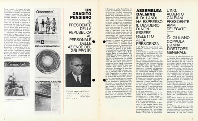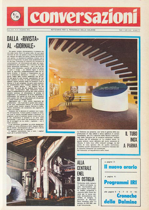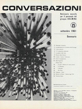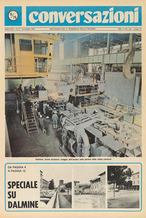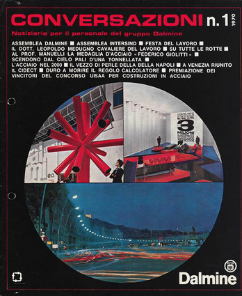 “Conversazioni” è l’house organ della Dalmine pubblicato a partire dalla metà degli anni Cinquanta, in una fase di rapido cambiamento strutturale dell’azienda siderurgica caratterizzato dall’espansione sul mercato interno e più intensi rapporti con l’estero. Al suo esordio, la rivista si presenta come un notiziario interno destinato al personale e impegnato a sostenere “colloqui cordiali” tra i dipendenti e la direzione, e quindi incentrato sul racconto dei principali avvenimenti dell’azienda. Lo stesso editoriale di presentazione sottolinea l’obiettivo di “stare, a mezzo di questo foglio, in frequenti colloqui col Personale” fornendo un’informazione condivisa e promuovendo la comune appartenza alla stessa “famiglia” aziendale (n. 1, dicembre 1954). In alcuni brevi periodi della sua storia, “Conversazioni” assume un’impostazione di maggior respiro dedicando attenzione a tematiche d’interesse generale, sia in ambito culturale che economico e sociologico. Ma, in oltre 25 anni di pubblicazioni, nella variabilità di registri linguistici e grafici, la sua funzione principale è quella di canale di informazione interna orientato a favorire lo spirito di appartenenza all’impresa e la condivisione dei suoi “comuni” interessi, attraverso la valorizzazione delle politiche sociali di assistenza, prevenzione, sicurezza, previdenza a favore dei dipendenti.