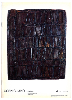 Nel corso dell’annata 1958 le copertine diventano prevalentemente fotografiche. In seguito, esse cominciano a ospitare opere di vari artisti, il cui profilo viene brevemente presentato nella pagina del sommario. Nel numero 1 del 1959, compare una Pittura su acciaio di Emilio Scanavino. Nel fascicolo successivo è la volta di Georges Mathieu, con un’opera intitolata Siderurgia; quindi, nell’ordine: Renzo Vespignani, ancora un’incursione di Carmi, poi Riccardo Manzi, Gianni Dava, una Composizione in ferro di Alberto Burri e un’opera dello “scultore siderurgico” Nino Franchina, che aveva già realizzato per la Cornigliano una scultura in ferro intitolata Commessa 60124, (pubblicata in controcopertina nel num. 5, 1959). Infine, nel 1960, quando ormai la fusione con l’Ilva era imminente, le copertine furono dedicate a Arnaldo Pomodoro con una composizione in acciaio e rame dal titolo Sintesi della laminazione e a Agenore Fabbri, anch’egli con una scultura di acciaio. Come si vede, tutte le opere erano scelte in base ad un criterio di contiguità con il mondo della siderurgia, cui facevano sempre riferimento o il titolo o i materiali impiegati. La direzione artistica di Eugenio Carmi prevedeva il coinvolgimento di protagonisti della ricerca artistica contemporanea, cui si offriva una opportunità di visibilità mentre la loro opera contribuiva alla costruzione dell’immagine pubblica della Cornigliano.