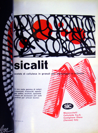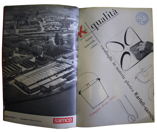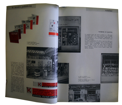 È così che nascono le pagine in cui i cestini per la merenda dei bambini sono fotografati all’interno di un vero asilo infantile; oppure le fotografie in cui secchi Kartell sono ripresi accanto ai contadini, sullo sfondo di una fattoria, nel corso di una mattinata nella campagna lombarda (Ks 1801 cestino asilo e Buongiorno al secchio in n.7, Estate/Autunno 1958). È una formula che fonde abilmente giornalismo e pubblicità, rifiutando le immagini costruite in studio e dando vita a «copertine, servizi, reportage veri e propri, viaggi per i mercati in cerca di carretti carichi di materia plastica, o meglio, in cerca di due teste annoiate al di sopra di una montagna di secchi e di tinozze di polietilene». Mentre la rivista promuove gli articoli Kartell, proclama l’intenzione di documentare e celebrare una «nuova civiltà degli oggetti». Lo fa con una fotografia che arriva ad ‘ambientare’ bicchieri, spremiagrumi, secchi, bacinelle, caraffe e tinozze di plastica in «un’austera aula di un istituto di belle arti, con alle pareti e sugli scaffali teste, figure, bassorilievi».