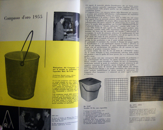 Non a caso il primo fascicolo si apre con due pagine che celebrano la vittoria del Compasso d’oro 1955 assegnata al secchio in polietilene progettato da Gino Colombini per Kartell. È subito un’occasione per riconoscere «l’importanza del nuovo rapporto di collaborazione tra il mondo dell’arte e il mondo della produzione» e per mettere al centro delle preoccupazioni della rivista il design. Si annuncia infatti che al disegno industriale sarà dedicata una «rubrica fissa» specificando, a proposito della scelta della testata, «che la nostra battaglia si basa essenzialmente sull’arma della qualità del prodotto». Viene chiarito anche l’obiettivo più importante che si pone il periodico: l’educazione del pubblico, ritenuta «indispensabile» per ottenere successo puntando su alti standard tecnici ed estetici.