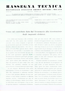 Di particolare interesse è l’articolo dedicato al contributo del TIBB alla ricostruzione degli impianti elettrici dopo la Seconda Guerra Mondiale: pubblicato a partire dalla prima pagina del gennaio-marzo 1948, primo numero edito dopo i cinque anni di sospensione della rivista, l’articolo racconta il massiccio lavoro di ricostruzione postbellico operato su sottostazioni, trasformatori, locomotori e macchinari elettrici. Al di là dell’impegno civico in un’Italia uscita a pezzi dal conflitto viene orgogliosamente ribadito che “naturalmente questa mole di lavoro è anche una diretta conseguenza della larga misura in cui il nostro macchinario è rappresentato un po’ dovunque”. La rivista, ora trimestrale, nel dopoguerra continua a occuparsi dei medesimi temi che hanno caratterizzato l’house organ dalla sua fondazione mettendo sempre in evidenza gli aspetti tecnici legati all’innovazione e alla ricerca. Con l’irrompere degli anni Sessanta la rivista incomincia a subire una flessione sia nei contenuti che quantitativa, sicuramente causata dal mutato clima sociale e dal cambio di mercato, che portò nel dicembre 1970 alla chiusura di una delle migliori testimonianze scritte dell’eccellenza industriale italiana.