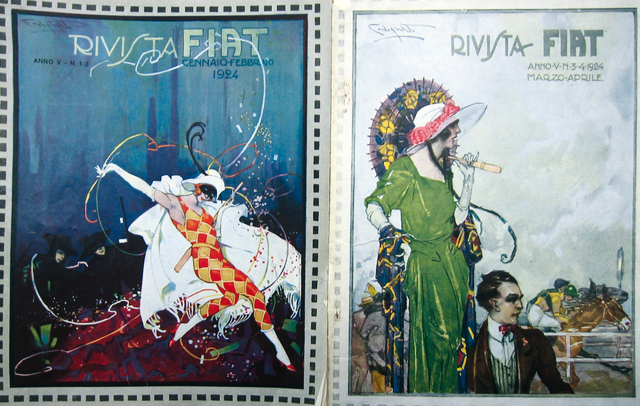 La guerra causa l’interruzione delle pubblicazioni; la ripresa, alla metà del 1923, si richiama direttamente all’esperienza prebellica per quanto riguarda i contenuti, destinati ancora ai clienti automobilisti e agli appassionati dell’automobilismo sportivo (Ai lettori, n. 1, a. IV). Al di là della dichiarazione di intenti, però, è rimarchevole la cesura fra il primo e il secondo ciclo della rivista, sia relativamente alle scelte grafiche, sia nella selezione dei contenuti. L’impronta dell’illustratore Plinio Codognato definisce la grafica delle copertine a colori, delle pubblicità in quarta di copertina (olio Fiat) e delle pagine interne (con vignette e illustrazioni al tratto, talvolta a colori, a corredo di racconti e dialoghi o a commento di articoli tecnici, con il personaggio ricorrente del “fattorino” che ammicca in varie pose al lettore): il noto grafico e illustratore, autore di coeve campagne pubblicitarie per altre imprese (Pirelli, Cinzano, Campari) arriverà, in una collaborazione che durerà negli anni, a identificare lo “stile Fiat” degli anni Venti con le sue immagini, fra suggestioni della belle epoque, art déco e futuriste, non solo per la “Rivista Fiat”, ma anche per i manifesti e in tutte le campagne pubblicitarie realizzate per la Fiat in questo periodo.