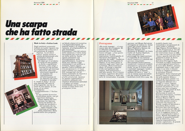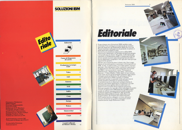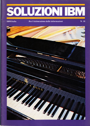 “Soluzioni IBM” è uno dei periodici pubblicati dalla società IBM italiana, la cui prima pubblicazione risale alla fine degli anni Settanta. Dopo cinque anni la testata cambia la sua veste editoriale in linea con i mutamenti nella struttura organizzativa della IBM italiana, che aveva conosciuto un aumento della produzione di nuovi macchinari sempre più specializzati e destinati ad un gruppo ampio e diversificato di clienti. Da questo momento in poi, il periodico trimestrale offre una panoramica molto ampia di ambienti applicativi differenti: dall’azienda manifatturiera all’ente locale, dalla banca al supermercato, dal tessile all’assicurazione.