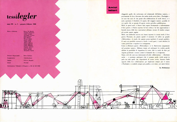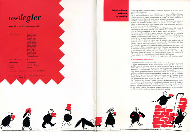Nel secondo numero si dà conto della votazione della giuria: il titolo prescelto è «Tessilegler» proposto da Luigi Rottini, assistente alla tessitura. Altri titoli suggeriti vengono invece utilizzati per le rubriche: L’aquilotto è dedicata ai bambini figli dei dipendenti, La siesta alla pagina di svago, Traguardi Legler alle attività sportive dopolavoristiche. Viene premiata anche la copertina, sebbene in realtà quella effettivamente utilizzata nei primi numeri della rivista risulterà differente dalla proposta originaria. Entrambe le copertine sono studiate da Gian Luigi Lazzari, impiegato dell’ufficio stampa. Tuttavia, dal n. 2, a. II, marzo-aprile 1959, dal quale la rivista passa a ventiquattro pagine, la grafica di copertina è affidata a una figura esterna all’azienda e affermata nel graphic design, Max Huber, che sostituisce per soli tre numeri Mario Scheichenbauer, altra figura di rilievo nel settore della grafica e del design, oltre che dell’architettura. Scheichenbauer ritornerà a occuparsi dell’impaginazione della rivista fino alla fine del 1962. Dal 1963 l’impaginazione verrà rilevata da uno dei titolari della Stamperia Stefanoni di Lecco alla quale era passata anche la pubblicazione della rivista.