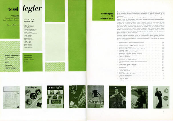 La stampa a due colori (il nero abbinato a una tinta diversa in ogni numero) resta una costante per tutta la durata della rivista. Questa scelta tipografica, probabilmente dettata da ragioni di costi, diventa un mezzo per caratterizzare un impaginato sostanzialmente classico sia per la disposizione dei testi che delle immagini. Anche per alcune copertine tra il 1959 e il 1960, un colore associato al nero delle scritte e delle immagini diventa elemento distintivo. Le pagine interne possono essere stampate con il nero e lo stesso colore della copertina oppure con un colore diverso. In quest’ultimo caso, per la seconda di copertina e la prima pagina della rivista, la grafica può sfruttare tre colori per un migliore effetto (il nero e le due tinte di copertina e pagine). Nelle pagine, le campiture di colore pieno fanno da sfondo di volta in volta a titoli, vignette, grafici e tabelle. In alcuni casi, il colore serve anche a virare le fotografie. Le pagine maggiormente caratteristiche risultano essere, tuttavia, la seconda di copertina con la prima pagina della rivista, considerate in molti numeri come uno spazio unico in cui gestire le informazioni editoriali e l’Editoriale. Tale continuità tra le due pagine è sottolineata in molti casi anche da schizzi, probabilmente realizzati dallo stesso Scheichenbauer, estesi lungo la larghezza delle due pagine. Altre vignette e schizzi sono spesso pubblicati nella restanti pagine ed in alcuni casi sono opera anche di dipendenti-collaboratori. Se le modifiche dell’impaginato all’interno della rivista, pur presenti, non sono così rilevanti, diverso il discorso per quanto riguarda la copertina che, dopo il primo significativo cambiamento di cui si è detto, presenta un ulteriore e radicale cambiamento con i numeri 3 e 4 del 1960. Al di là dell’aspetto grafico, il cambio di copertina sancisce di fatto un’evoluzione dei contenuti che, nell’arco dei 38 numeri è ben percepibile. A pagine dedicate in larga misura all’attività di stabilimento (con articoli tecnici sui metodi di produzione, tecnologie adottate, migliorie), alla vita dei dipendenti (nella rubrica Notizie di casa nostra, una delle poche presenti costantemente in tutti i numeri), alle notizie sulle attività dopolavoristiche, si vanno progressivamente aggiungendo, con un enfasi e un peso rilevante, pagine sulle relazioni esterne, sull’immagine “alla moda” che i prodotti del cotonificio vanno conquistando. Questo spiega perché, se nei primi 14 numeri la copertina presenta una “carrellata” di fotografie di vita aziendale e di vita familiare dei dipendenti, dal numero 15 in poi lo spazio è occupato dalla fotografia di una modella con abiti realizzati da affermate case di moda utilizzando i tessuti del cotonificio. Copertine di questo tipo avvicinano maggiormente la rivista all’aspetto di un magazine femminile che a un notiziario aziendale. Non per nulla in alcuni numeri viene specificato che la fotografia di copertina è dovuta al reparto Pubblicità / Promotion che trae l’immagine dal fascicolo «Moda Legler Italia», un periodico realizzato per la vendita dei tessuti Legler.
