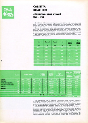 I dipendenti venivano quindi invitati a imbucare le proposte per il concorso in apposite cassette poste all’interno dello stabilimento. Le “cassette” sono le stesse che serviranno anche per la raccolta dei “suggerimenti” che il personale sottopone alla direzione per migliorare metodi di lavoro, formazione del personale e reparti dello stabilimento. La “cassetta dei suggerimenti”, poi “cassetta delle idee”, diventa una delle rubriche ricorrenti in molti dei numeri della rivista.